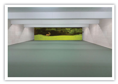 Skjutplatserna är placerade på 25 meters avstånd från filmduken, där visar vi filmsekvenser på riktiga djur i sin naturliga miljö. Upp till fyra skyttar kan samtidigt träna och förbättra sitt skytte. Med hjälp av avancerad datorteknik och IR-känsliga kameror registreras kulhålen och träffarna visas på duken i realtid; fullträff, bom eller bukskott – inget undgår systemet.
