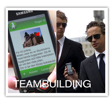 Ett typiskt spel utspelar sig ute på stan, på landet eller varsomhelst där ni vill att grupper om 4-5 personer ska få lösa uppdrag tillsammans. Man får informationen och löser problemen via mobiltelefonen. Svaren finns ute i omgivningen, på gator och torg eller på konferensanläggningen! Ett jättepopulärt event just nu...